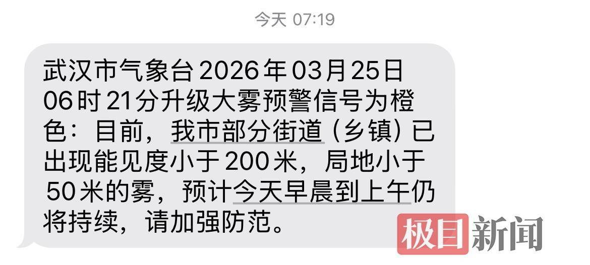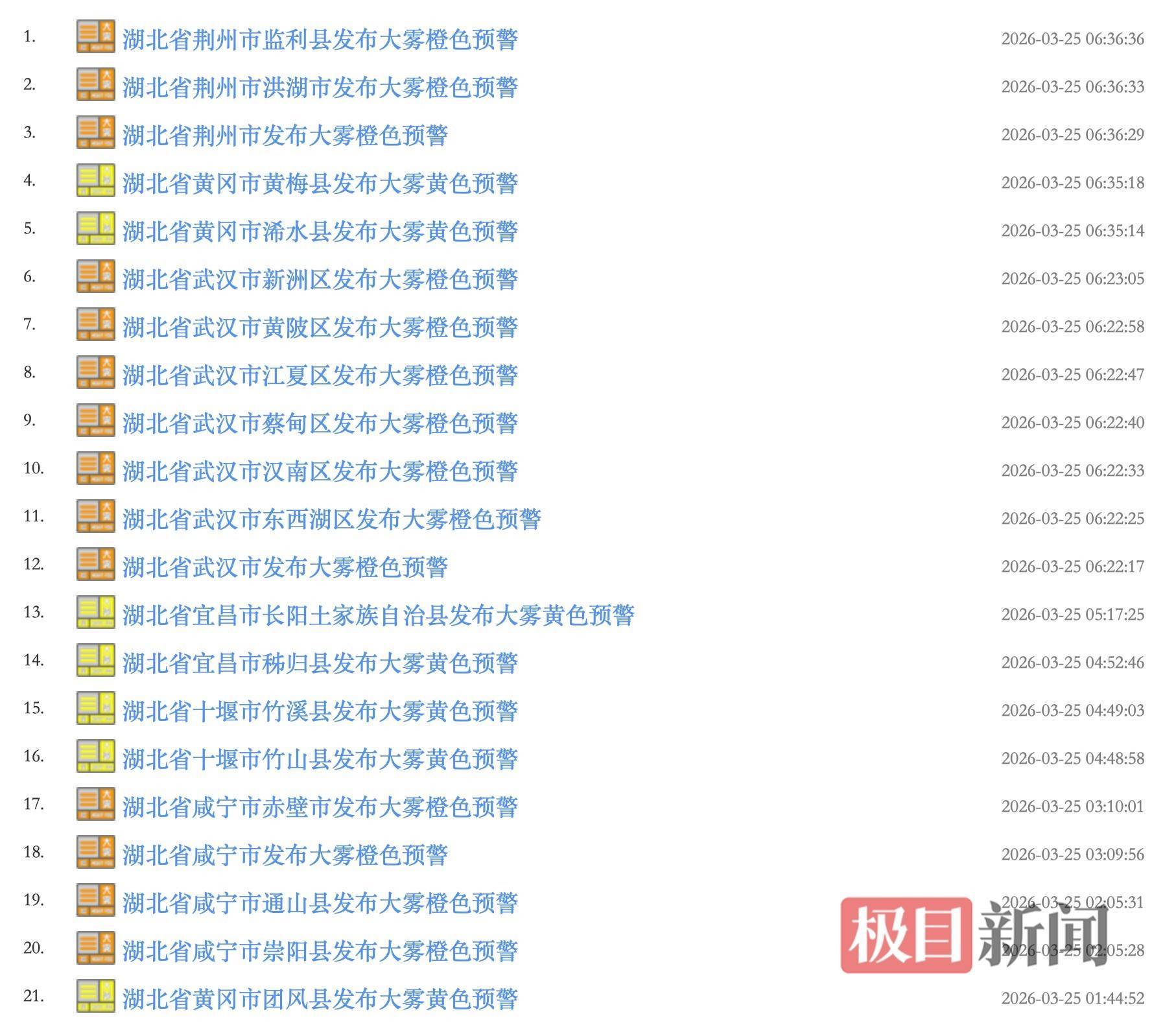 2026年3月25日凌晨起,湖北省多个市州陆续发布大雾预警信号,其中荆州、武汉、咸宁等地发布大雾橙色预警,黄冈、宜昌、十堰等地发布大雾黄色预警,提醒公众注意出行安全,防范低能见度天气带来的影响。